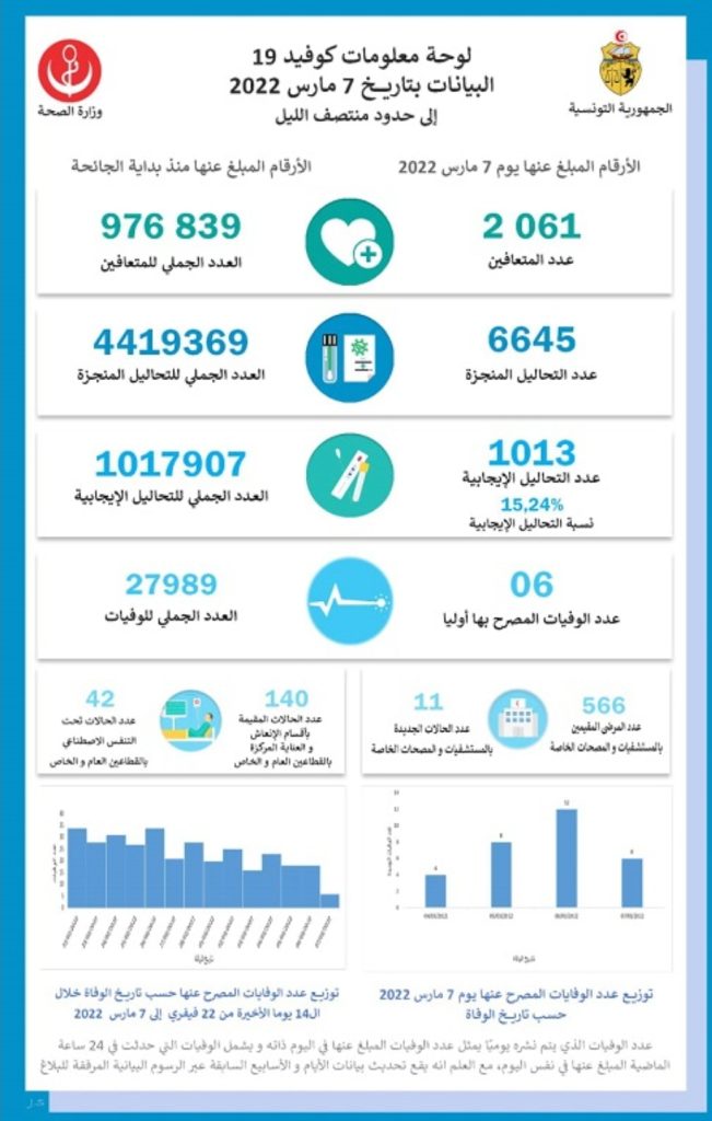 أعلنت وزارة الصحة عن تسجيل 6 وفيات و1013 إصابة جديدة بفيروس كورونا، وذلك بتاريخ 7 مارس الحالي.وارتفعت بذلك الوفيات بالفيروس، منذ بداية انتشار الوباء، إلى 27989 حالة وفاة والإصابات إلى 1017907 إصابة.