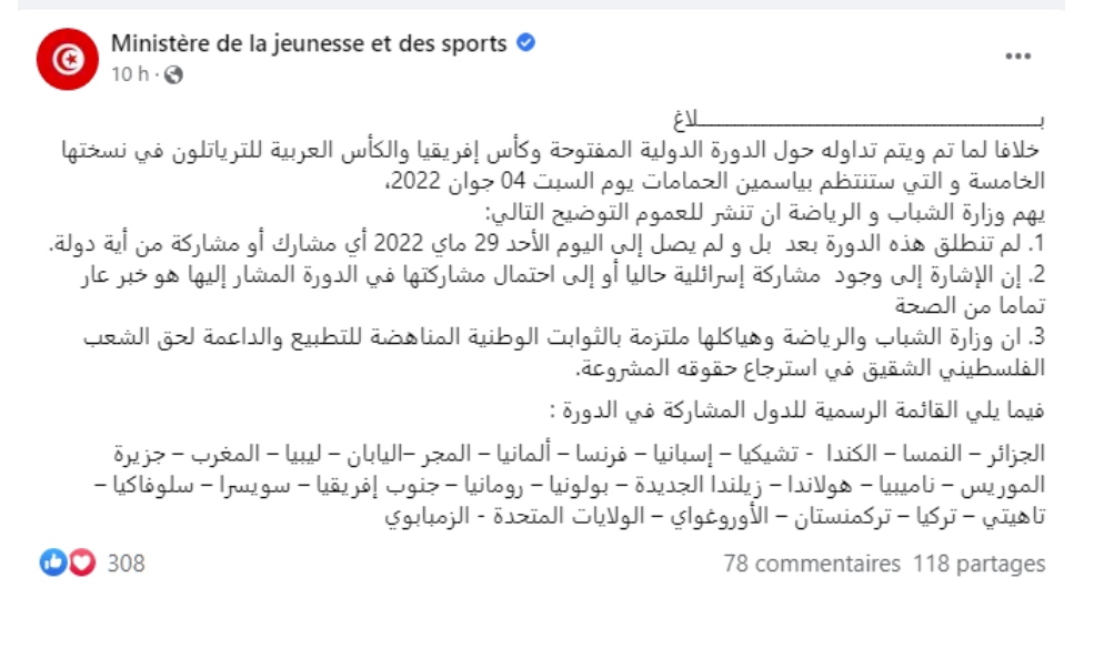اصدرت وزارة الشباب و الرياضة بلاغا اكدت من خلاله ان مشاركة لاعبة من الكيان الصهيوني في الدورة الدولية المفتوحة وكأس إفريقيا والكأس العربية للترياتلون في نسختها الخامسة و التي ستنتظم بياسمين الحمامات يوم السبت 04 جوان 2022،هو خبر عار تماما من الصحة.