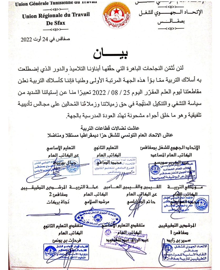 أعلنت نقابات أسلاك التربية والتعليم بصفاقس في بيان مشترك مقاطعتها ليوم العلم المقرر اليوم الخميس بمقر الولاية وذلك تعبيرا منها عن استيائها ”الشديد” مما اعتبرته سياسة التشفي و التنكيل المنتهجة في حق المربين المحالين على مجالس تأديبية وصفتها بالتلفيقية وهو ما خلق أجواء ”مشحونة” تهدد العودة المدرسية بالجهة.