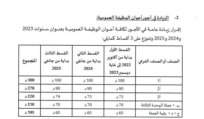 وينص الاتفاق على الزيادة في الأجور لكافة أعوان الوظيفة العمومية بعنوان سنوات 2023 و2024و2025 على 3 أقساط.