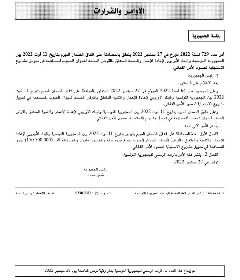 صدر في العدد الأخير من الرائد الرسمي للجمهورية التونسية بتاريخ اليوم الأربعاء 28 أوت 2022، أمرا رئاسيا يتعلق بالمصادقة على اتفاق الضمان المبرم بتاريخ 11 أوت 2022 بين الجمهورية التونسية والبنك الأوروبي لإعادة الإعمار والتنمية المتعلق بالقرض المسند لديوان الحبوب للمساهمة في تمويل مشروع الإستجابة لصمود الأمن الغذائي.