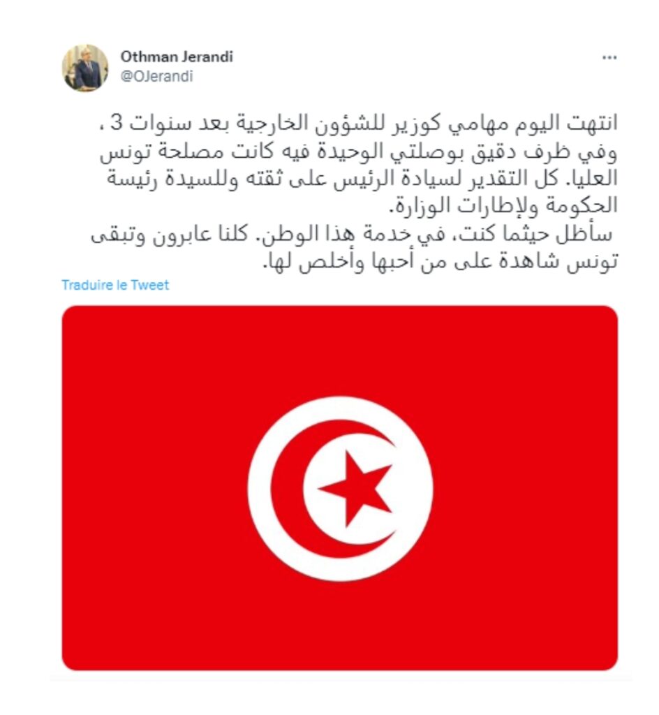 نشر وزير الشؤون الخارجيّة والهجرة والتونسيين بالخارج المُقال عثمان الجرندي تغريدة على حسابه بتويتر إبان صدور قرار إعفائه من مهامه أمس الثلاثاء 7 فيفري 2023.