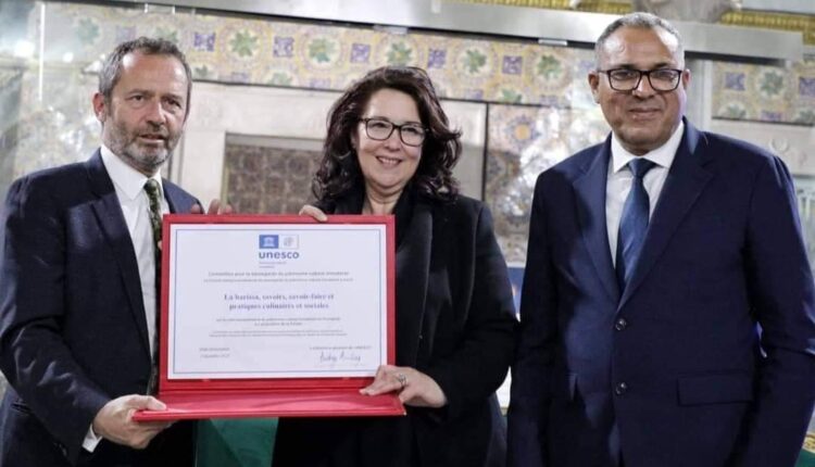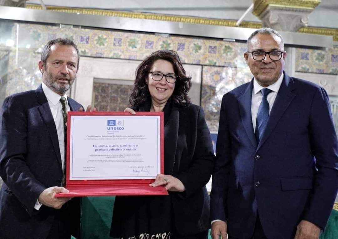 بمناسبة حدث تسجيل عنصر “الهريسة : المعارف والمهارات والممارسات المطبخيّة والاجتماعيّة” ضمن القائمة التمثيلية للتراث الثقافي غير المادي للإنسانية لليونسكو في ديسمبر 2022 بالرباط، واحتفاء بالذّكرى العشرين لتوقيع اتفاقية اليونسكو لحماية التراث الثقافي غير المادي، أشرفت وزيرة الشؤون الثقافية الدكتورة حياة قطاط القرمازي مساء يوم السبت 15 افريل 2023 بمركز الفنون والثقافة والآداب “القصر السعيد” على حفل تسليم شهادة إدراج عنصر “الهريسة” في القائمة المذكورة لليونسكو، وذلك بحضور وزير التربية السيد محمد علي البوغديري ومدير المكتب الإقليمي لليونسكو بالدول المغاربية السيد “إيريك فالت” وسعادة سفراء كل من الاتحاد الأوروبي السيد “ماركوس كورنارو” وإيطاليا السيد “فابريزيو ساجيو” وألمانيا السيد “بيتر بروغل” وهولندا السيدة “جوزفين باربرا فرانتازن”، وممثل وزير الشؤون الخارجية والهجرة والتونسيين بالخارج السيد خالد السهيلي وممثل مدير عام المنظمة العربية للتربية والثقافة والعلوم الألكسو السيد مراد المحمودي إلى جانب أعضاء من الفريق العلمي لملف الهريسة، وإطارات الوزارة.