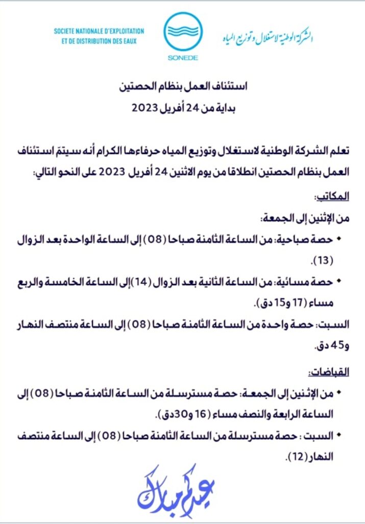 أعلنت الشركة التونسية لاستغلال وتوزيع المياه، اليوم السبت، عن استئناف العمل بنظام الحصتين انطلاقا من يوم الاثنين 24 أفريل 2023، على النحو التالي: