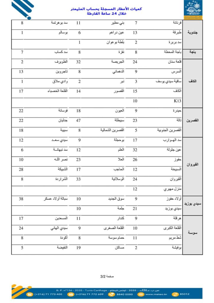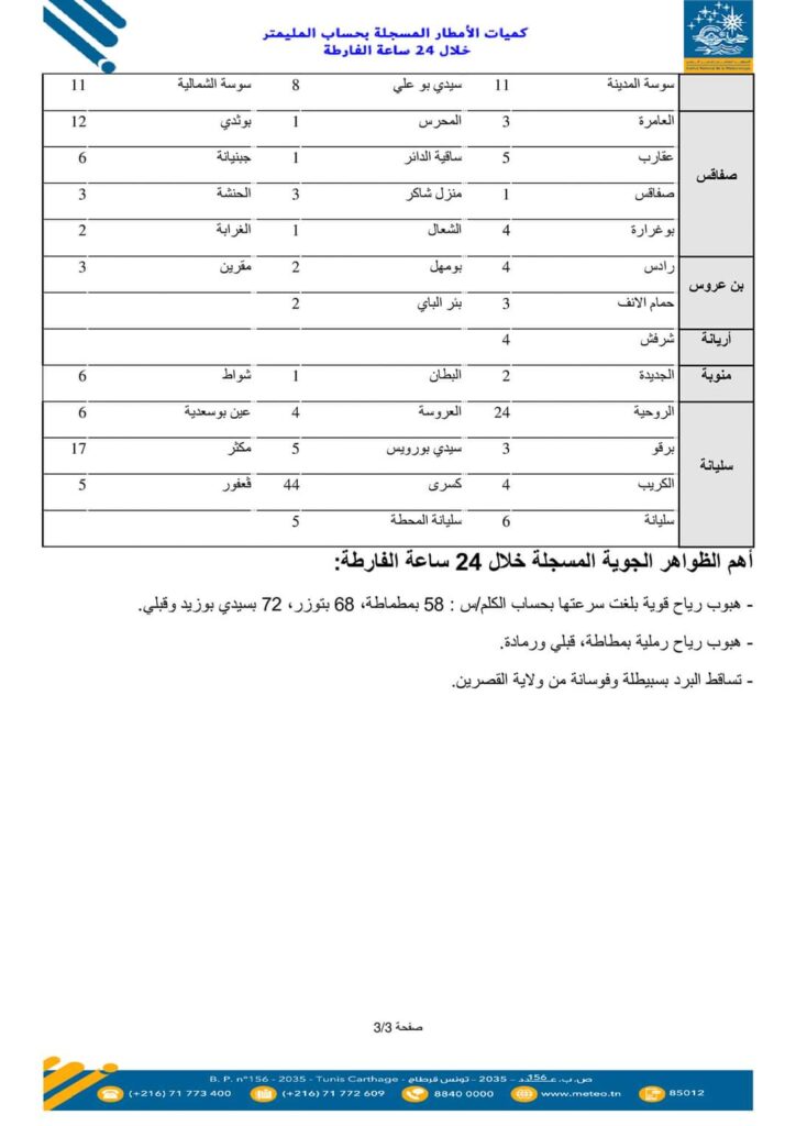 وفيما يلي القائمة النهائية لكميات الأمطار وأهم الظواهر الجوية المسجلة في الـ 24 ساعة الماضية :