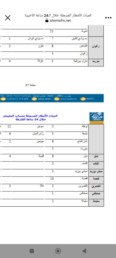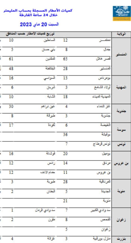 متابعات كميات الأمطار المُسجّلة خلال الـ24 ساعة الأخيرة By halketwassl Last updated مايو 20, 2023 34 حلقة وصل _ فريق التحرير نشر المعهد الوطني للرصد الجوي، اليوم السبت 20 ماي 2023، قائمة لكميات الأمطار المُسجّلة خلال الـ24 ساعة الفارطة في عديد المناطق.وفيما يلي كميات الأمطار المسجّلة 34 Share FacebookTwitterGoogle+ReddItWhatsAppPinterestالبريد الإلكتروني
