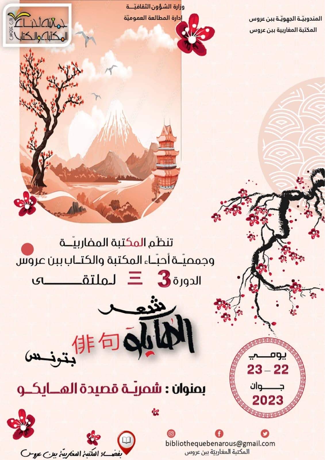 تحت إشراف وزارة الشؤون الثقافية، تنظّم المكتبة المغاربيّة ببن عروس ملتقى شعر الهايكـو بتونس في دورته الثالثة بعنوان “شعريّة قصيدة الهايكو” يومي الخميس 22 والجمعة 23 جوان 2023 وذلك بالشراكة مع جمعية أحباء المكتبة والكتاب بالجهة.