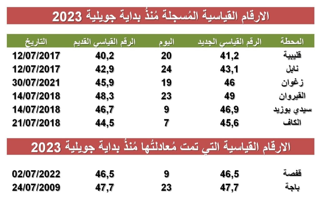 نشر رئيس مصلحة التوقعات الجوية بالمعهد الوطني للرصد الجوي، محرز الغنوشي، اليوم الإثنين 24 جويلية 2023،  جدولا يبينالأرقام القياسية لدرجات الحرارة المسجلة منذ بداية شهر جويلية الجاري.