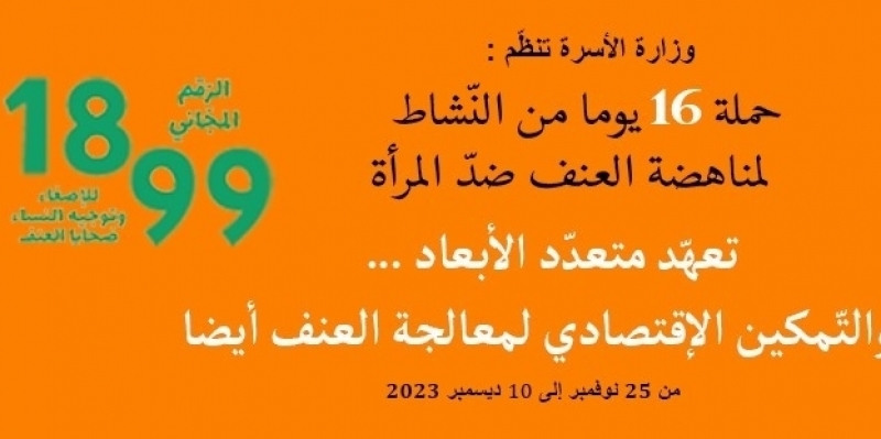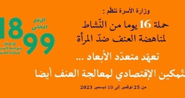 تنخرط تونس كسائر دول العالم في الحملة الدّوليّة “16 يوما من النّشاط لمناهضة العنف ضد المرأة” التي تنطلق سنويا من 25 نوفمبر الموافق لليوم العالمي للقضاء على العنف ضدّ المرأة، لتتواصل إلى غاية 10 ديسمبر 2023 تزامنا مع اليوم العالمي لحقوق الإنسان.
