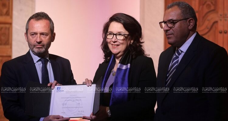 وتسلمت هذه الشهادة، وزيرة الشؤون الثقافية حياة قطاط القرمازي، في موكب التأم مساء الأربعاء بمركز الموسيقى العربية والمتوسطية النجمة الزهراء، وحضره وزير التربية محمد علي البوغديري بصفته رئيس اللجنة الوطنية التونسية للتربية والعلم والثقافة، ومدير مكتب اليونسكو بالرباط « إيريك فالت » والهادي جلاب مدير عام الأرشيف الوطني إلى جانب عدد من السفراء وممثلي البعثات الديبلوماسية بتونس.