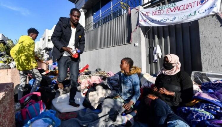 عدد من المهاجرين الأفارقة العالقين في تونس أمام مقرّ المفوضيّة السامية لشؤون اللاجئين رافعين شعار “إجلاء إجلاء”.