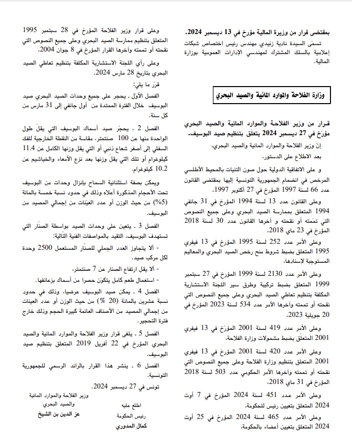 صدر في العدد الأخير للرائد الرسمي للجمهورية التونسية بتاريخ أمس 27 ديسمبر 2024، قرار من وزير الفلاحـة والموارد المائية والصيد البحري يتعلّق بتنظيم صيد أسماك البوسيف.