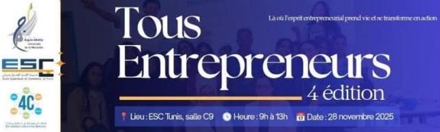 تحتضن المدرسة العليا للتجارة بجامعة منوبة يوم الجمعة 28 نوفمبر 2025 فعاليات النسخة الرابعة من تظاهرة “كُلنا روّاد أعمال”، التي ينظمها طلبة السنة الأولى ماجستير ريادة الأعمال وتطوير المشاريع المبتكرة بالجهات.