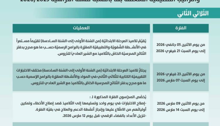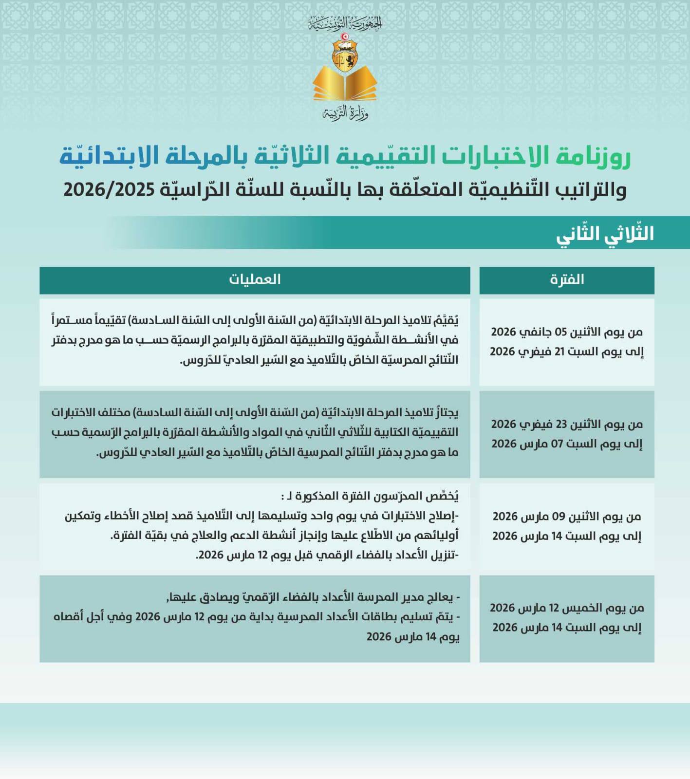 شرع صباح اليوم الإثنين 23 فيفري 2026 تلاميذ المرحلة الابتدائية والإعدادية والثانوية، في اجتياز الاختبارات الكتابية بعنوان الثلاثي الثاني للسنة الدراسية 2025-2026.